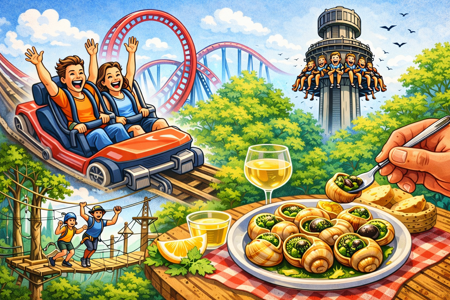 In een ander Frans pretpark, Nigloland, doen we er nog een schepje bovenop. De Donjon de l’Extrême is een toren van honderd meter hoog, de hoogste draaiende vrijevaltoren ter wereld. Terwijl we langzaam omhoog draaien, lijkt het allemaal nog mee te vallen. De zon schittert op de metalen constructie, het landschap wordt steeds kleiner. Even is er alleen stilte — en dan dat plotselinge loslaten. In drie seconden raas je naar beneden, de wind giert langs je oren. Als we uitstappen, heb ik even een stoeltje, een glaasje water en een croissantje nodig om bij te komen. De kinderen stuiteren alweer richting de volgende attractie, alsof er niets gebeurd is.